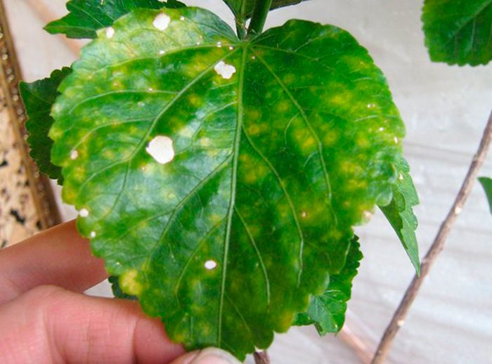 najczęściej hibiskus uprawiany na otwartym terenie jest dotknięty chlorozą. W chorym krzaku dolne płytki liściowe krążą wokół, a młode liście natychmiast rosną w bladożółtym odcieniu. Może się to zdarzyć, ponieważ gleba zawiera bardzo mało żelaza i azotu, dlatego podczas podlewania zaleca się dodanie chelatu żelaza do wody. Jednocześnie wiosną do gleby konieczne jest wprowadzenie złożonego nawozu mineralnego, który zawiera azot.