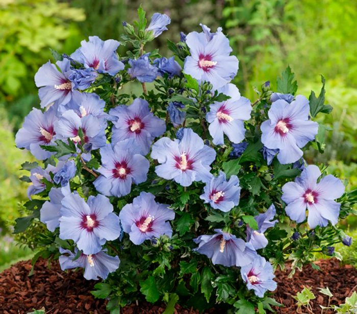 - Vayelit Ilar Double . Ten wyprostowany potężny krzew jest ozdobiony półpełnymi lub podwójnymi kwiatami o niebieskawo-fioletowym kolorze z czerwonymi plamami w środku.