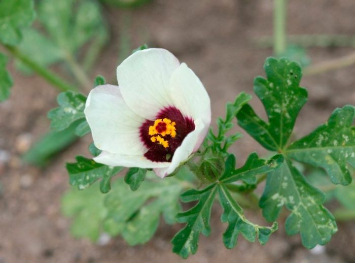 ojczyzną tego gatunku jest Afryka Północna i Środkowa. Jednak do tej pory jest szeroko uprawiany we wszystkich dziedzinach rolnictwa nawadniającego. Hibiskus ma korzeń palowy, a także rozgałęzioną prostą łodygę, której wysokość wynosi około 0,8 m.na powierzchni regularnie rozmieszczonych trójdzielnych płytek liściowych występuje pokwitanie, mają również ogonek. Bladożółte kwiaty osiągają około 40 mm średnicy, ich środek jest ciemnoczerwony. Gatunek ten ma jedną charakterystyczną cechę: jego kwiaty otwierają się rano, a po południu zamykają. Czas kwitnienia takiej rośliny wynosi ponad 30 dni. Faktem jest, że nowe pąki tworzą się w zatokach każdej płytki liściowej, a jeśli krzew rośnie w sprzyjających warunkach, tworzenie kwiatów nastąpi każdego dnia.