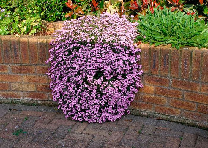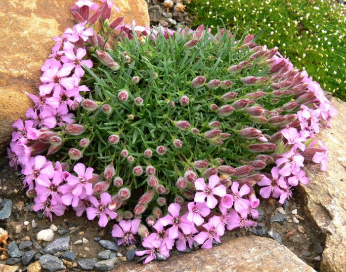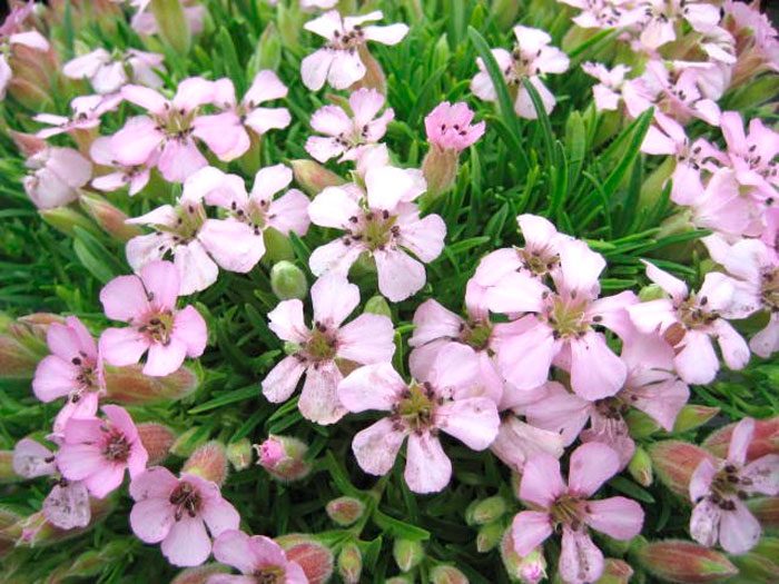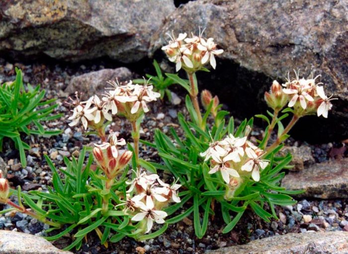 ten gatunek pochodzi z Alp, tam występuje na wysokości 0,5-2 tysięcy metrów nad poziomem morza. Taka obficie kwitnąca roślina wieloletnia tworzy miękkie poduszki z nisko pełzającymi łodygami, których wysokość może osiągnąć 20 centymetrów. Wąskie płytki liściowe o matowym zielonym kolorze mają owalny, liniowy kształt. Na wierzchołkach pędów wideł powstaje wiele kwiatostanów w kształcie parasola, które obejmują małe pachnące kwiaty w kształcie gwiazdy o różowo-czerwonym kolorze. Gatunek ma wysoką odporność na mróz, ale jeśli zimą zamarznie, może szybko odzyskać dzięki samosiewowi. Najpopularniejsze odmiany: