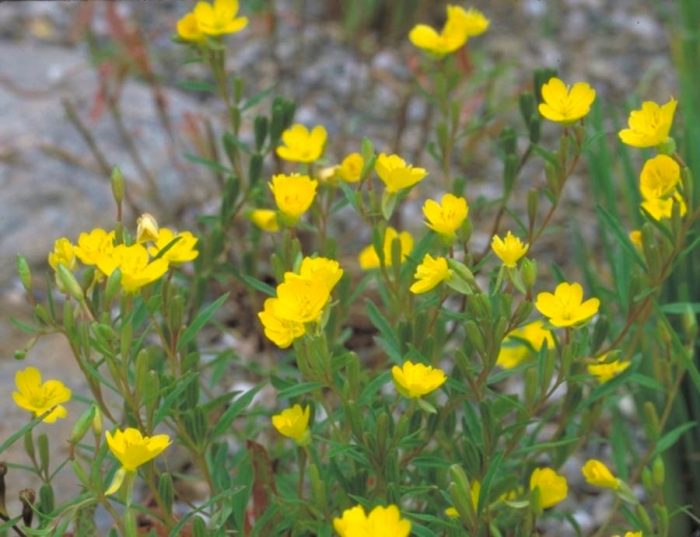 wysokość takiego krzewu waha się od 0,3 do 0,8 metra. Potężna łodyga jest silnie rozgałęziona. Przeciwnie rozmieszczone całe spiczaste do wierzchołka płytki liściowe o wydłużonym kształcie lancetowatym i ciemnozielonym kolorze. Pachnące czteropłatkowe kwiaty osiągają 70 milimetrów średnicy i mają żółty kolor.