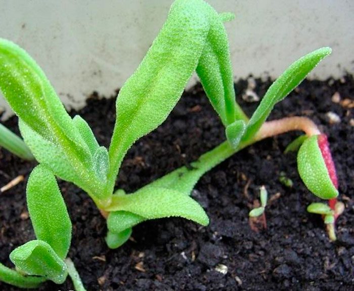 rozwój delikatnych sadzonek jest bardzo powolny, a także nie mają odporności na zgniliznę korzeni , w związku z tym, aby wyhodować sadzonki takiej kultury, należy ją odpowiednio podlać. Szklarnia, w której rosną sadzonki, musi być dobrze wentylowana, a mieszanka gleby powinna być zawsze nieco wilgotna. Aby go zwilżyć, musisz użyć opryskiwacza. Po tym, jak roślina jest silniejsza i tworzą 2 prawdziwe płytki liściowe, należy je rozłożyć na poszczególnych pojemnikach (plastikowe kubki lub doniczki), które są wypełnione tą samą mieszanką gleby, ale należy zauważyć, że powinno być w niej dużo piasku. Karmienie takiej rośliny w okresie sadzonek nie jest konieczne.