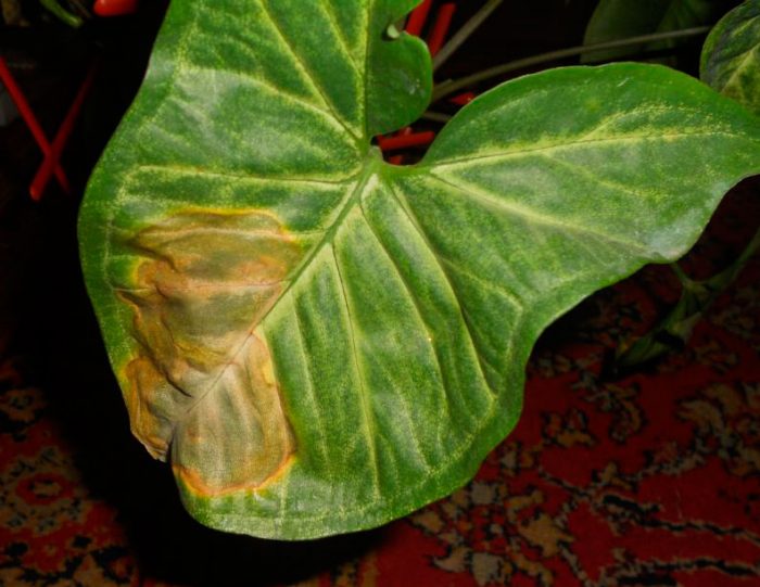 - latanie po liściach . W przypadku, gdy w pomieszczeniu, w którym znajduje się syngonium, wilgotność powietrza będzie bardzo niska, wówczas końcówki i wierzchołki blaszek liściowych stają się brązowe. Po pewnym czasie liście zaczynają latać.