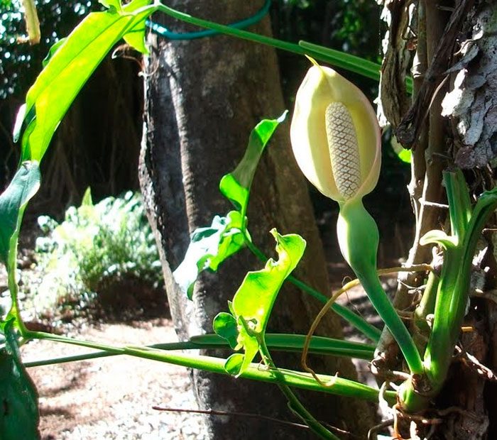 z reguły roślina ta nie kwitnie, gdy jest uprawiana w pomieszczeniach. Ale jeśli nadal zakwitnie, kwiat będzie reprezentowany przez niezbyt duże ucho, które jest owinięte białym kocem.