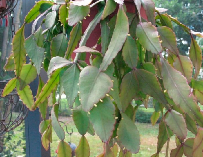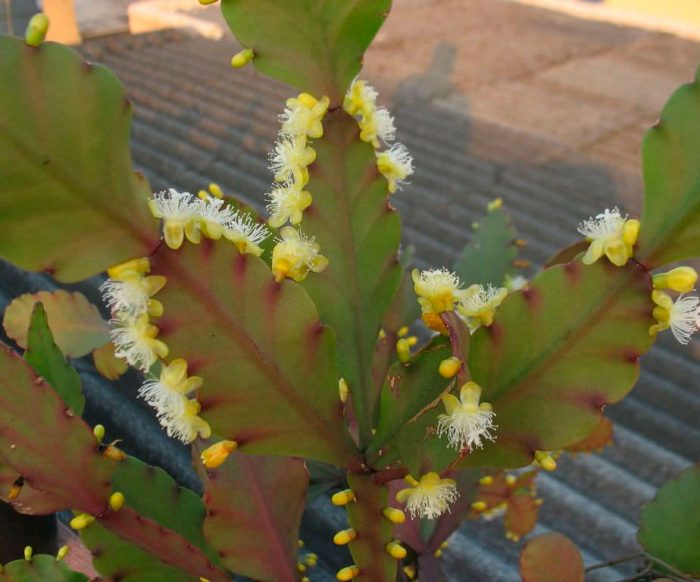bujny krzew tego sukulentu składa się z zwisających łodyg. A skład tych łodyg obejmuje płaskie segmenty o wydłużonym kształcie, a każdy z nich zdobi mały kremowy kwiat. Kiedy na krzaku nie ma kwiatów, wygląda bardzo podobnie do Schlumbergera.
