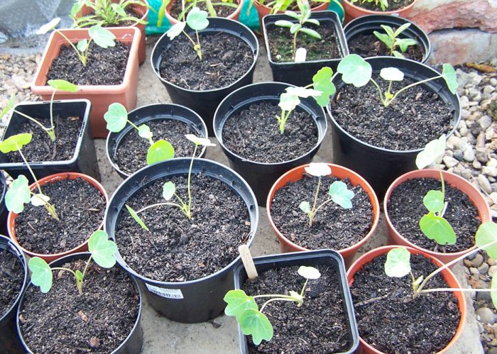 nasturcja może być również uprawiana przez sadzonki, w którym to przypadku kwitnienie nastąpi wcześniej niż podczas siewu nasion na otwartej glebie. Do siewu musisz użyć kubków z wysuwanym dnem lub torfu. Siew nasion odbywa się w kwietniu lub maju, zakopuje się je w podłożu o 20 mm, a 2 lub 3 nasiona umieszcza się w 1 szklance. Następnie kubki są przestawiane w chłodne (od 20 do 22 stopni) miejsce. Pierwsze sadzonki pojawią się po około 15 dniach. Pojawiające się rośliny powinny mieć dobre oświetlenie, aby się nie rozciągały, w przeciwnym razie po przesadzeniu na otwarty teren będą bolały przez długi czas i nie kwitną. Ponieważ system korzeniowy nasturcji jest dość kruchy i słaby, a powierzchnia liści jest duża, sadzonki nie są zbierane, a sadzonki sadzi się na otwartej glebie bezpośrednio w filiżankach, nie naruszając integralności ziemnej śpiączki.