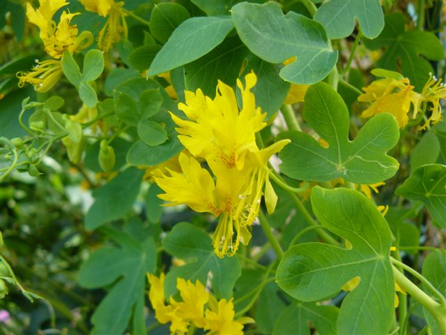ojczyzną tego pnącza jest Ameryka Południowa. Długość zielonkawych pędów może osiągnąć 3,5 m, podczas gdy stosunkowo szybko oplatają kraty i altany. Kwitnienie rozpoczyna się w połowie lata, a kończy wraz z nadejściem mrozu. Małe kwiaty o bogatym żółtym kolorze mają faliste płatki, a także zielone ostrogi. Małe płytki liściowe mogą być pięcio-lub siedmiodzielne. Na średnich szerokościach geograficznych nasiona nie mają czasu na dojrzewanie.