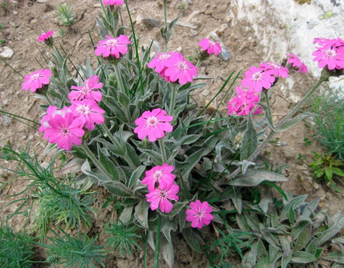 - lichnis frotte floret . Wysokość krzewu wynosi około 0,3 m.liniowe wąskie podstawowe płytki liściowe są pomalowane na ciemnozielony kolor. Kwiatostany racemose składają się z podwójnych kwiatów o fioletowym kolorze, osiągających średnicę 20-30 mm.