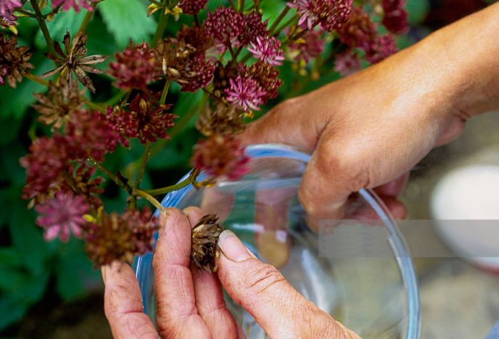 jeśli planujesz zbierać nasiona z astrantii, podczas kwitnienia zarysuj najbardziej spektakularne i duże kwiatostany. Kiedy zaczną wysychać, należy nałożyć na nie worki z gazy, co zapobiegnie wylaniu dojrzałych nasion na powierzchnię witryny. Całkowicie wysuszone nasiona należy przyciąć i umieścić do wyschnięcia w dobrze wentylowanym suchym pomieszczeniu, rozkładając je na arkuszu gazety. Po wyschnięciu należy usunąć z nich nasiona, z których suszone płatki są usuwane. Nasiona umieszcza się w małym kartonowym pudełku lub w torbie z papieru, która jest usuwana w ciemnym i suchym miejscu.