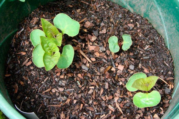 pierwsze sadzonki można zobaczyć po 5 lub 6 dniach. Kiedy pojawią się pędy, nie zapomnij usunąć schronienia i przestawić kubków w dobrze oświetlonym miejscu. Po pojawieniu się jednej prawdziwej płytki liściowej u sadzonek konieczne będzie przerzedzenie sadzonek. Aby to zrobić, w każdym kubku za pomocą nożyczek należy przyciąć sadzonkę do powierzchni podłoża, która wydaje się najsłabsza, aby nie mogła zakłócać wzrostu i rozwoju silniejszej rośliny. W tym samym czasie sadzonki będą musiały być karmione po raz pierwszy, używając do tego na przykład Fertiki, roztworu lub silnego.