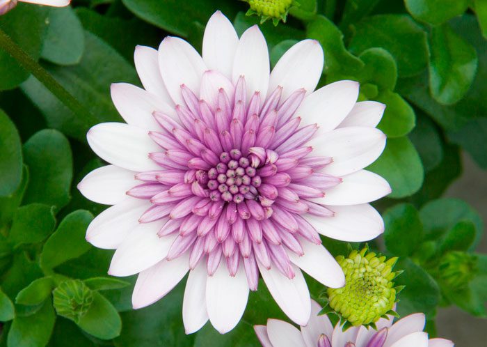 - Bamba . Ta odmiana, w porównaniu z innymi odmianami i gatunkami osteospermum, ma szersze kwiaty brzegowe. Kiedy kwitną, mają czysty biały kolor, który z czasem zastępuje się fioletem.