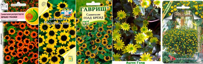 powyżej wspomniano już, że tylko 1 gatunek jest uprawiany przez ogrodników-sanvitalia rozpostarta. Uzyskano jednak dość dużą liczbę odmian i mieszańców takiej rośliny. Na przykład: