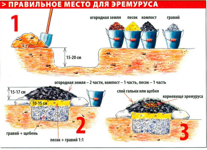 konieczne jest sadzenie zarówno zakupionego, jak i uprawianego własnymi rękami materiału do sadzenia we wrześniu. Do sadzenia należy wybrać oświetlone otwarte miejsce z dobrze przepuszczalną glebą, ponieważ ten kwiat reaguje wyjątkowo negatywnie na stagnację cieczy w glebie. Taka roślina ma bardzo silne łodygi, które są nieustraszone podmuchami wiatru. W dzikich warunkach eremurus woli rosnąć na płaskowyżu, gdzie często jest neutralna lub zasadowa gleba. Jednak ten kwiat można uprawiać na prawie każdej glebie.