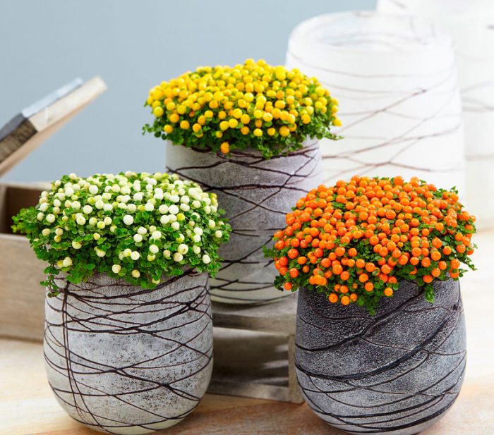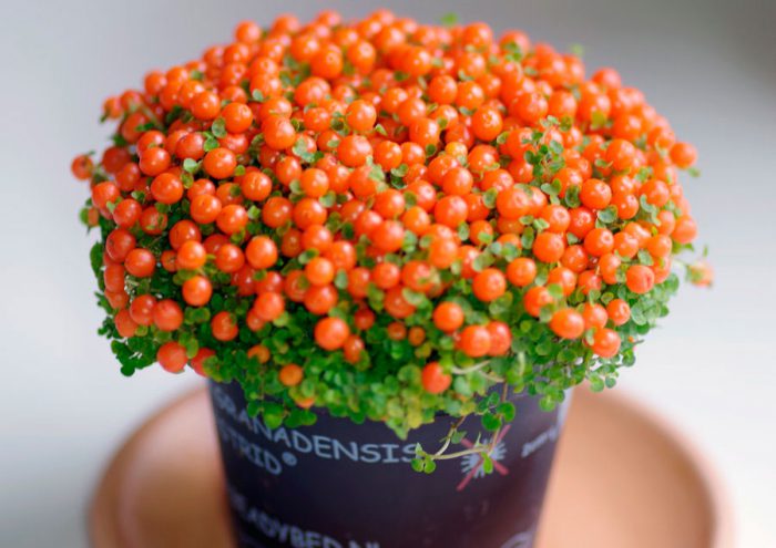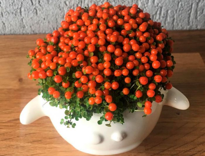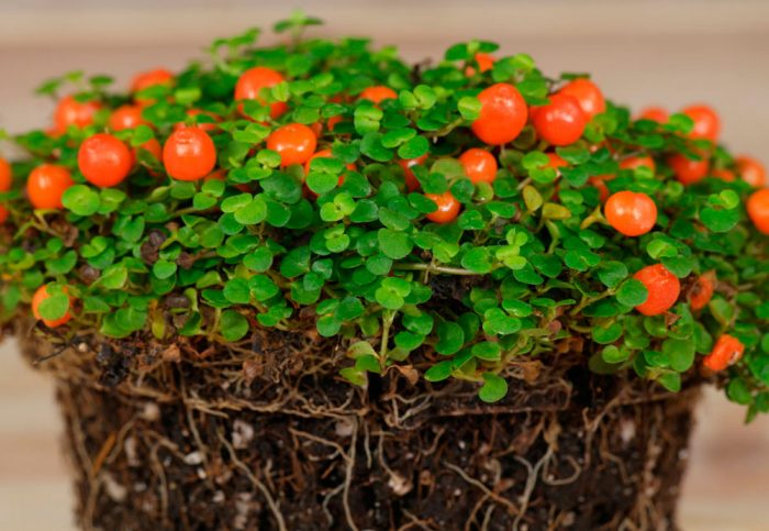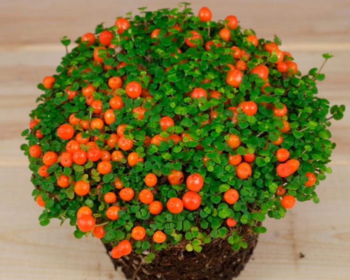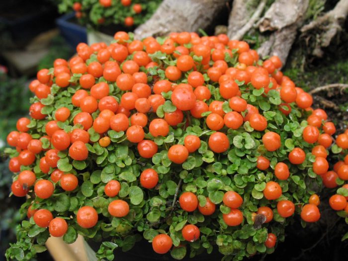 lub nertera Granada. Roślina pochodzi z Meksyku i Ameryki Środkowej. Jego pędy są cienkie i pełzające. Długość lancetowatych okrągłych blaszek liściowych wynosi 3-7 mm, a ich ogonki nie są większe niż 2-4 mm.w czerwcu na krzaku pojawiają się żółto-zielone kwiaty. Kiedy roślina zanika, tworzą się na niej pomarańczowe jagody, które nie latają przez całą jesień, ale w sprzyjających warunkach przez całą zimę.