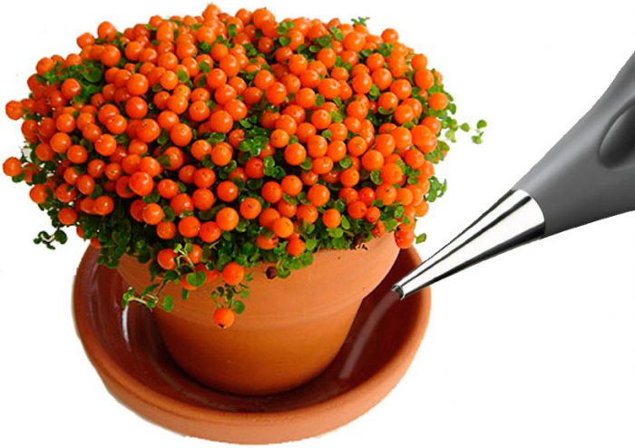 w okresie aktywnego wzrostu rośliny jest systematycznie nawilżana z butelki z rozpylaczem, w tym celu stosuje się gotowaną lub dobrze osadzoną wodę, której temperatura powinna być zbliżona do temperatury pokojowej. Regularne opryskiwanie roślin odbywa się aż do początku kwitnienia, należy pamiętać, że kropelki wody nie powinny spadać na powierzchnię kwiatów i owoców. Aby zwiększyć poziom wilgotności powietrza, mokre kamyki, torf lub ekspandowana glina wlewa się do miski, a następnie umieszcza na niej pojemnik z rośliną. Dno garnka w żadnym wypadku nie powinno stykać się z wodą na patelni.