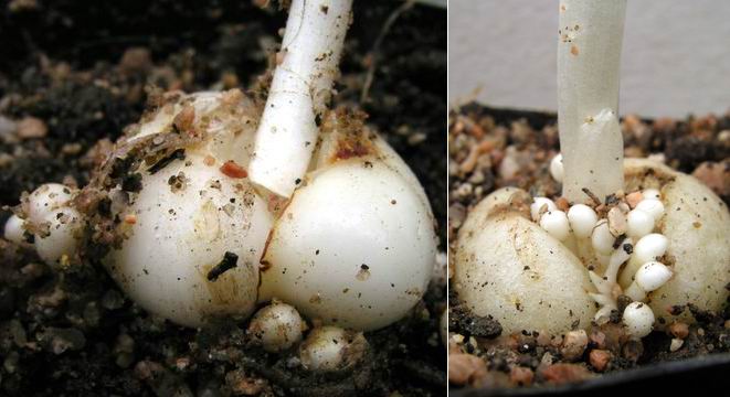 W razie potrzeby możesz "zmusić" dorosłą żarówkę do utworzenia dziecka. Kiedy latem cebule zostaną wykopane, powinieneś wybrać największy z nich i absolutnie zdrowy. Weź wysterylizowane narzędzie i w najbardziej mięsistej części żarówki wykonaj płytkie skrobanie, którego średnica powinna wynosić 20 mm. rana powinna wyschnąć na powietrzu bez żadnych zabiegów. Następnie zakopuje się go w piasku (zawsze czystym i suchym) i czyści w dobrze wentylowanym suchym pomieszczeniu. Po tym, jak w ostatnich dniach sierpnia lub w pierwszych dniach września ma korzenie, sadzi się go na otwartym terenie, po uprzednim potraktowaniu środkiem grzybobójczym. Wszystkie jajniki są usuwane, ponieważ roślina powinna wydawać energię tylko na tworzenie dzieci. Kiedy usuniesz żarówkę z ziemi, bądź bardzo ostrożny, ponieważ trudno jest zauważyć małe dzieci.