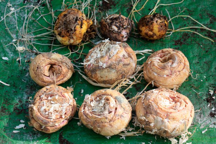 do przechowywania żarówek należy wybrać dobrze wentylowane suche pomieszczenie, w którym nie ma gorętszego niż 30 stopni. Będą tam od pierwszych dni lipca do ostatnich sierpnia, aż do pojawienia się korzeni. Konieczne jest regularne sprawdzanie ich, co pozwoli na szybką identyfikację chorych lub zgniłych żarówek.
