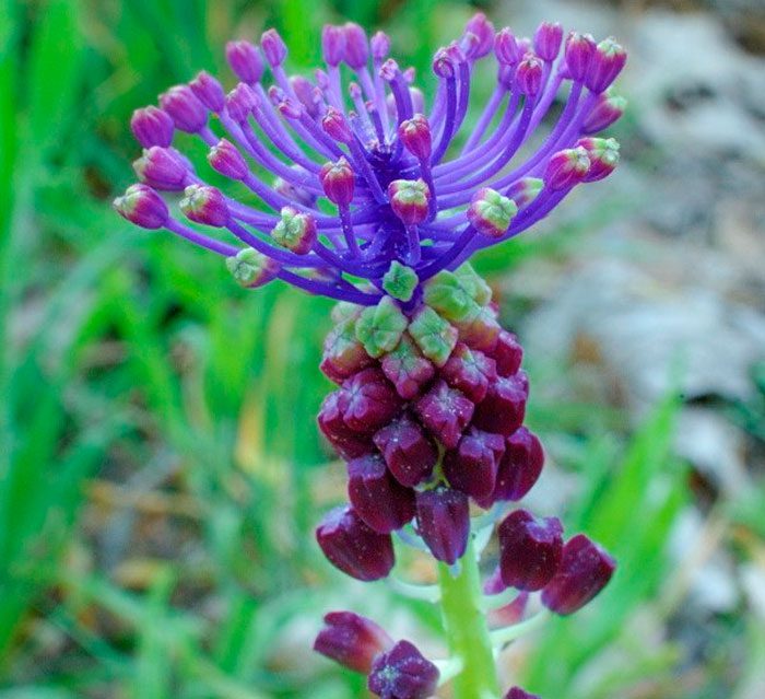 Muscari (Muscari) jest również nazywany hiacyntem myszy lub cebulą żmii. Ta bulwiasta bylina należy do rodziny szparagów (Asparagaceae), ale wcześniej ten rodzaj był przedstawicielem rodziny liliowców lub hiacyntów. Rodzaj ten skupia około 60 gatunków. W warunkach naturalnych takie rośliny można znaleźć na skraju lasu, wśród krzewów, a także na górskich zboczach Kaukazu, Krymu, Południowej i Środkowej Europy, Azji Mniejszej i Morza Śródziemnego. Takie rośliny należą do najwcześniejszych wiosennych kwiatów i bardzo często są uprawiane do cięcia. Kwiaty Muscari mają bardzo silny, ale dość przyjemny zapach. Małe, ale bardzo spektakularne kwiaty Muscari zdobią trawniki, ogrody skalne i rabatki. Takie kwiaty są również używane jako rośliny graniczne.