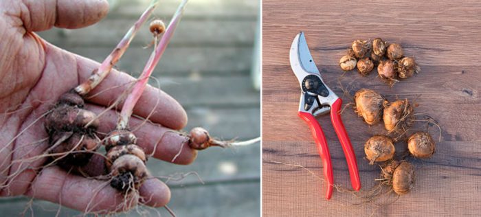 podział jest zwykle wytwarzany po sadzeniu staje się bardzo gęsty. Aby to zrobić, wiosną musisz wykopać bulwę i ostrożnie oderwać dzieci od żarówki rodzicielskiej, które są następnie sadzone w stałym miejscu. Jednocześnie zaleca się sadzenie dzieci w tym samym przedziale czasowym, co sadzenie sadzonek, a mianowicie w ostatnich dniach kwietnia lub w pierwszych dniach maja. Jeśli chcesz, na początek oddzielone dzieci można sadzić w indywidualnych doniczkach, w których będą rosły do maja lub czerwca. A następnie będą musiały zostać przeszczepione na otwartą glebę.