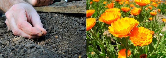 jeśli chcesz wydać mniej energii, powinieneś wysiewać nasiona na otwartej glebie w kwietniu lub październiku. Wiosną należy rozpocząć siew po wyschnięciu i rozgrzaniu gleby po masowym stopieniu pokrywy śnieżnej. Aby sprawdzić gotowość gleby do siewu tej rośliny, musisz zebrać garść gleby w ogrodzie i zacisnąć ją w pięści, a następnie należy ją wyrzucić ze stu centymetrów wysokości. Jeśli gleba jest gotowa do siewu, bryła będzie musiała całkowicie się kruszyć. Gleba musi być przygotowana do siewu. Tak więc, około pół miesiąca przed planowaną datą siewu, będzie musiał zostać wykopany, jednocześnie wprowadzając nawóz. Tak więc na 1 metr kwadratowy należy wziąć 20 gramów chlorku potasu i superfosfatu, od 3 do 4 kilogramów próchnicy i 30 gramów mocznika. Jednak doświadczeni ogrodnicy zalecają wykonanie tej procedury nawet jesienią, tylko podczas gdy nawóz zawierający azot będzie musiał zostać wprowadzony do gleby w miesiącach wiosennych. Nasiona należy zakopać w glebie o 10-20 mm. między krzakami należy zachować odległość od 25 do 30 centymetrów, odległość między rzędami powinna wynosić od 0,6 do 0,7 m. Jeśli takie rośliny są uprawiane jako surowce lecznicze, wówczas odległość między krzakami wynosi od 7 do 10 centymetrów, a odstępy między rzędami powinny wynosić od 0,3 do 0,4 metra. Jeśli wszystko zostanie wykonane poprawnie, pierwsze sadzonki pojawią się po 7 dniach. 15-20 dni po pojawieniu się pierwszych sadzonek roślina będzie musiała zostać przerzedzona, a odległość między sadzonkami powinna wynosić co najmniej 25-35 centymetrów. Te sadzonki, których nie można wyrzucić, ale przesadzić. Faktem jest, że nagietek bardzo dobrze toleruje przeszczepy. Kwitnienie rozpocznie się około 2,5 miesiąca po siewie.