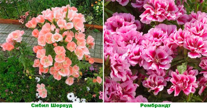 - Sybil Sherwood . Zwarte krzewy osiągają wysokość 0,3-0,4 m. płytki liściowe są lancetowate. Pędy są pomalowane na różowo-zielony kolor. Średnica półpełnych kwiatów wynosi około 5 centymetrów. Są pomalowane na łososiowo-różowy kolor, a kolor rozjaśnia się od środka kwiatu do krawędzi płatka.