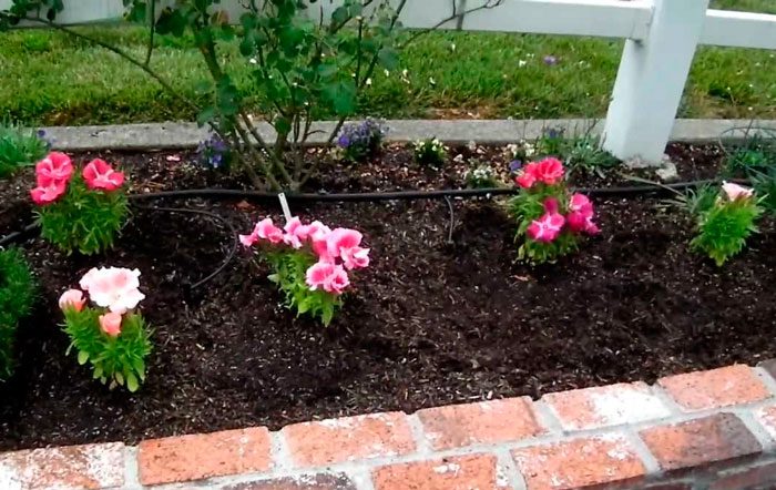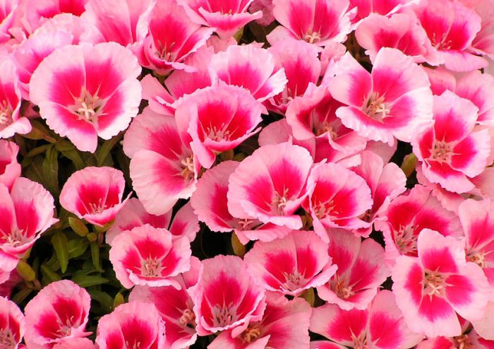 - Rembrandt . Wysokość niskich krzewów wynosi około 30-35 centymetrów i mają kształt półkuli. Łodygi są zielonkawo-różowe. Blaszki liściowe wąskolistne. Średnica różowych kwiatów frotte wynosi od 5 do 6 centymetrów. Płatki są faliste, postrzępione wzdłuż krawędzi, a na każdym z nich znajduje się czerwona plamka.