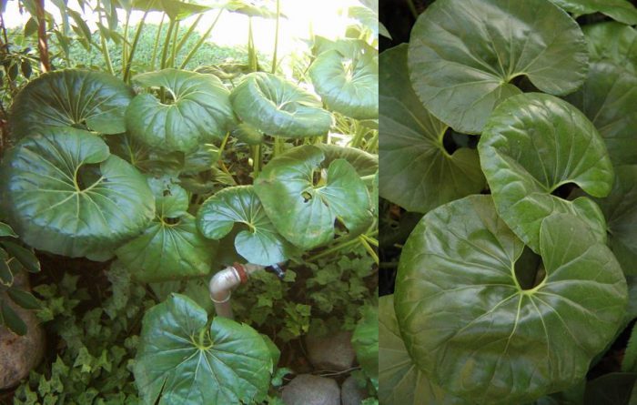 to japoński gatunek. Proste pędy są nieco rozgałęzione. Duże podstawowe płytki liściowe w kształcie nerki są prawie okrągłe, nierównomiernie ząbkowane, zielone. Ich średnica może osiągnąć 25 centymetrów. Na powierzchni ogonków znajduje się pokwitanie. Istnieje duża liczba jasnożółtych koszy o średnicy sięgającej 5 centymetrów. Są częścią corymbose wyprostowanych kwiatostanów, które znajdują się na rozgałęzionych szypułkach. Kwitnienie rozpoczyna się w lipcu. Jesienią obszar z tą rośliną należy wypełnić warstwą ściółki. Istnieje odmiana wczesnego kwitnienia. Jej kwiaty są pomalowane na złoty kolor, a kanciasto-zaokrąglone płytki liściowe są nasycone zielenią. Na liściach znajduje się krap o złotym kolorze.
