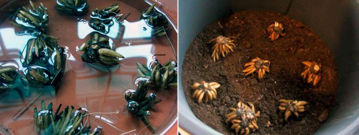 w przygotowanym otworze do sadzenia konieczne jest obniżenie bulwy "dziobem" na głębokość od 5 do 8 centymetrów. Między roślinami należy zachować odległość od 10 do 15 centymetrów. W przypadku, gdy spodziewane są przymrozki, sadzenie należy przykryć słomą lub specjalnym materiałem pokrywającym. Po 2-3 miesiącach na każdym krzaku rośnie kilka szypułek, a kwitnienie rozpocznie się po pewnym czasie.