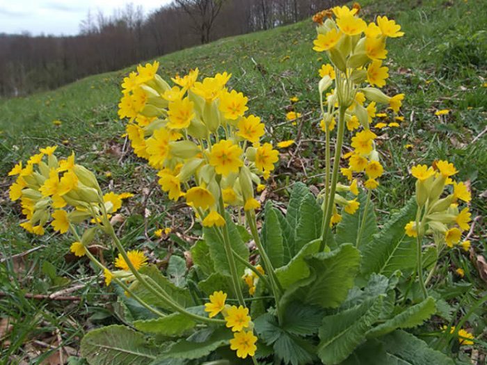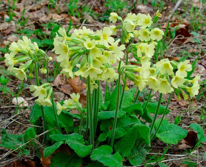 Ojczyzna Karpat, Południowych i północnych regionów Europy Zachodniej. Ta wieloletnia roślina ma owalne płytki liściowe z drobno ząbkowaną krawędzią. Ich długość wynosi około 5-20 centymetrów, a szerokość 2-7 centymetrów. Mają ostre zwężenie do ogonka. Na ich przedniej powierzchni żyły są wcięte, a na niewłaściwej ― wypukłe. Kwiatostany w postaci parasoli składają się z 5-15 pachnących kwiatów o średnicy dwucentymetrowej i pomalowanych na jasnożółty kolor, a u podstawy płatków znajdują się plamy o nasyconym żółtym kolorze. Wysokość lekko owłosionej szypułki wynosi około 10-35 centymetrów. Kwitnienie rozpoczyna się w kwietniu i trwa od 50 do 60 dni. Istnieją hybrydy z dużymi kwiatami w kolorze białym, czerwonym, liliowym, kremowym, żółtym. Mogą być zarówno jednokolorowe, jak i mieć oko lub obramowanie.