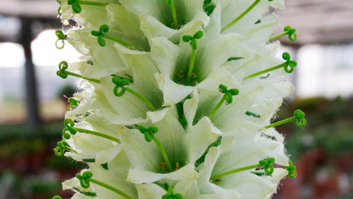 kwiatostan w kształcie kolca składa się z kwiatów w kształcie lejka. W dzwonkach w kształcie TYRSA są jasnożółte, podczas gdy w dzwonkach są nasycone fioletem.