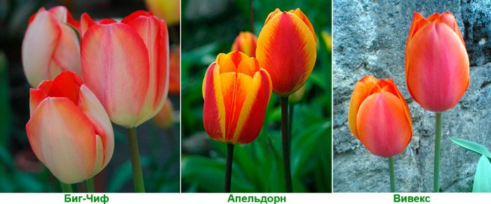 wysokość szypułki wynosi od 60 do 80 centymetrów. Średnica kwiatów przekracza 10 centymetrów. Pomalowane na jasnoczerwony lub inne odcienie tego koloru (są dwukolorowe). Tolerują przymrozki na wiosnę i nie podlegają wirusowi różnorodności. Odmiany: "Big Chif", "Apeldoorn", "Vivex".