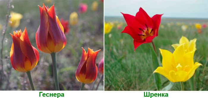 większość gatunków takich kwiatów uprawianych przez człowieka odnosi się do gatunku zwanego Tulipa gesneriana. A na wolności można spotkać gatunki: Tulipa sylvestris (tulipan leśny), Tulipa biebersteiniana (Tulipa Biberstein), Tulipa biflora (Tulipa biflora), a także Tulipa greigii, Tulipa pubescens, Tulipa eichleri itp.