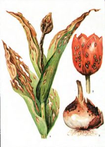 taka roślina jest podatna na chorobę sierpniową, której rozwój przyczynia się do wirusa martwicy tytoniu. Możesz dowiedzieć się, że tulipan jest zainfekowany zakrzywionym pędem i kwiatem oszpeconym paskami, na cebulkach pojawiają się również ciemne plamy. Zainfekowany kwiat musi zostać zniszczony. Aby to zrobić, wykopuje się go bezpośrednio glinianą bryłą, a do powstałego dołu należy wlać bardzo silny roztwór, do przygotowania którego na litr wody pobiera się 3 gramy kwasu borowego i 10 gramów manganu potasu. Gorący roztwór należy wlać do dołu. Zamiast roztworu możesz wlać popiół drzewny do dziury. W celu zapobiegania zdrowe tulipany są traktowane roztworem Fundazolu.