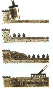 w suchych glebach bruzdy są obficie wylewane wodą. Nawóz do roślin cebulowych nakłada się na dno otworu, pod warunkiem, że nie został wprowadzony do kopania. Następnie przykryj go cienką warstwą piasku. Następnie w odległości 8-10 cm od dołu do dołu układa się żarówki. Aby uniknąć uszkodzenia spuchniętych korzeni, cebul nie można mocno wcisnąć w glebę. Aby uzyskać równomierne kwitnienie, duże cebule sadzi się w środku, a małe – po bokach.