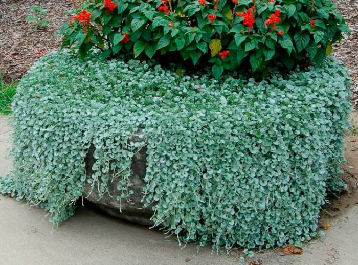projektanci krajobrazu często używają dichondry do tworzenia imitacji "biegnącego strumienia" na działce ogrodowej, wygląda bardzo nietypowo i pięknie. Gdy opadające pędy dotrą do powierzchni gleby, szybko się ukorzeniają, a roślina ampelowa staje się okrywą. Zdecyduj, czy regularnie skracasz łodygi, czy też będą rosły swobodnie, ale jeśli nie uszczypniesz końców pędów, krzew nie będzie tak wspaniały i spektakularny.