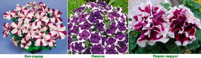 - Picoti . Skład tej serii obejmuje 4 hybrydy, które różnią się tym, że mają mocno pofałdowane krawędzie płatków, które są otoczone białą obwódką o szerokości dochodzącej do 15 mm.krzew osiąga wysokość 0,25 m. kwiaty są pomalowane na fioletowo, Fioletowo-niebieski, czerwony, różowy i szkarłatny.