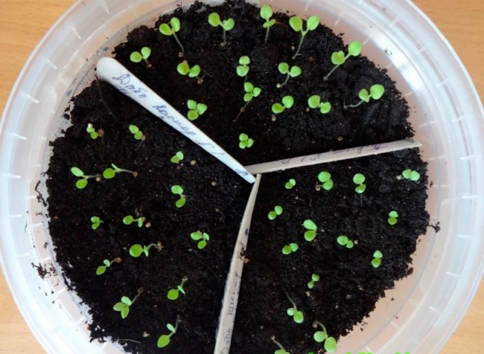 po około 7 dniach powinny pojawić się pierwsze sadzonki. Będą musiały być codziennie 2 razy dziennie wentylowane i nawilżane z opryskiwacza. W tym okresie bardzo ważne jest utrzymanie wysokiego poziomu wilgotności w mini-szklarni, ale z tego powodu na roślinach może rozwinąć się "czarna noga". Aby temu zapobiec, konieczne jest codzienne usuwanie kondensatu z filmu natychmiast po jego pojawieniu się, a szkło należy odwrócić drugą stroną. Ponadto sadzonki należy systematycznie rozpylać słabym roztworem potasu manganu. Kiedy rośliny utworzą pierwszą prawdziwą płytkę liściową, schronienie ze zbiornika będzie musiało zostać usunięte, powierzchnia podłoża zostanie pokryta cienką warstwą piasku i zmniejszone podlewanie.