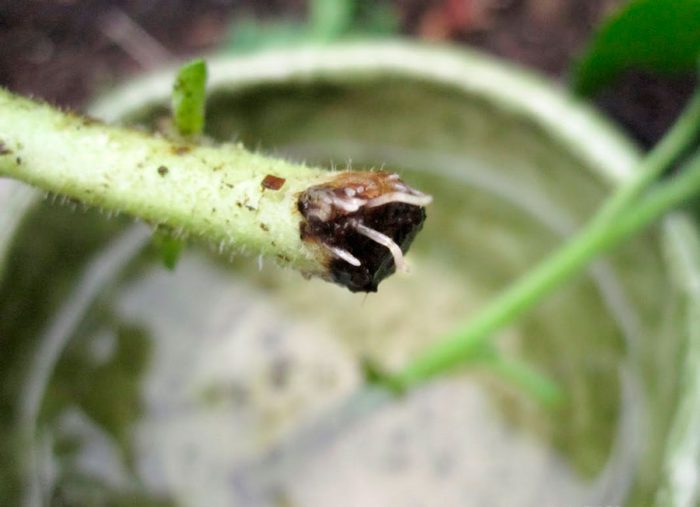 Wytnij wierzchołkowe sadzonki, które powinny mieć od 4 do 6 płyt liściowych. Oderwij wszystkie liście z wyjątkiem dwóch górnych. Pozostałe liście należy skrócić o ½ części. Sadzonki należy sadzić do ukorzenienia w samej mieszance gleby, która jest używana do sadzonek. Jednak w tym przypadku powierzchnia podłoża powinna być pokryta warstwą perlitu lub piasku o grubości 20-25 mm, którą należy rozlać roztworem fungicydu. Między sadzonkami należy zachować odległość 15-20 mm, a pojemnik jest pokryty szkłem na górze. Stosowanie środków stymulujących wzrost (na przykład Heteroauxin) jest niepotrzebne, ponieważ świeżo ścięte sadzonki są już dobrze ukorzenione, ale nie należy ich opóźniać przy sadzeniu. Podłoże w szklarni powinno być lekko wilgotne przez cały czas, w tym celu petunię należy nawilżać dwa razy dziennie z butelki z rozpylaczem. Należy jednak zauważyć, że nadmierna wilgoć przyczynia się do rozwoju "czarnej nogi" lub pleśni. Frotte i ampelous Petunia całkowicie zakorzenią się po około 7 dniach, a mini Petunia po 14 dniach.