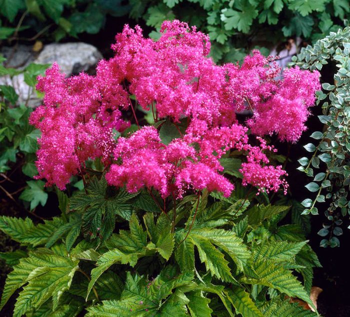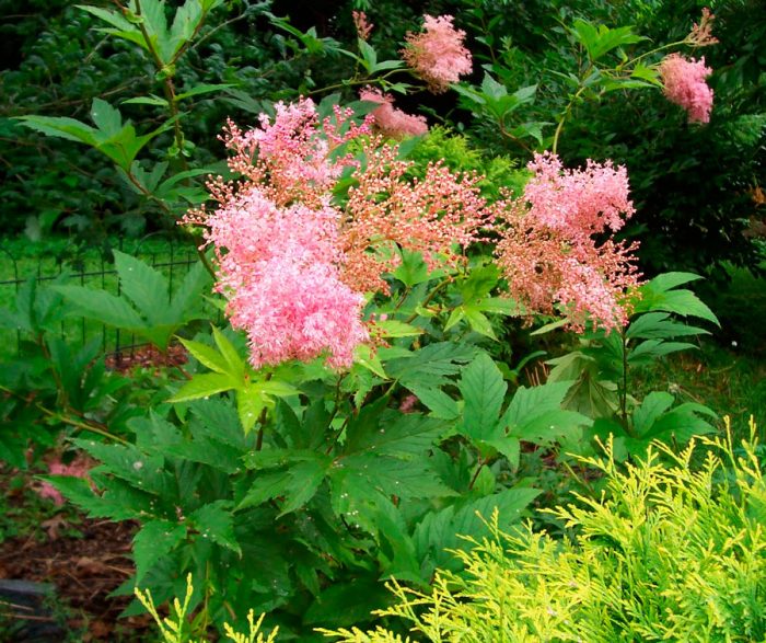 w okresie kwitnienia krzew jest ozdobiony kwiatostanami wiechowymi o średnicy sięgającej około 15 centymetrów. Składają się z małych (o średnicy do 10 mm) bladożółtych kwiatów. Szerokie pierzaste płytki liściowe Na Zewnątrz mają niewielkie podobieństwo do liści paproci. Ponieważ liście są duże, latem odparowuje duże ilości wody. Istnieją rodzaje tawuł, w których liście wysychają przez pewien czas w najgorętsze dni, co pozwala roślinie zmniejszyć ilość odparowanej wody. Kłącze krzewu jest krótkie. W ciągu 12 miesięcy korzenie tej rośliny rosną tylko o 20-30 mm. pachnące kwiaty mają aromat migdałowo-miodowy. Początek kwitnienia przypada na Czerwiec i trwa przez 6 tygodni.