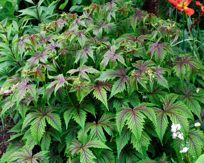 w warunkach naturalnych gatunek ten występuje na terytorium Wysp Kurylskich, Kamczatki, Sachalinu, a także w północnej części Japonii. Wysokość tak silnej rośliny może wynosić od 120 do 300 cm, a jej gruby kłącze jest dość silny. Na powierzchni prostych pędów występuje pokwitanie, są mocne i prążkowane, pomalowane na jasnoczerwony odcień, a ich średnica osiąga około 25 mm.Duże, szerokolistne podstawowe płytki liściowe są pierzaste z płytkimi palcowymi płatami końcowymi. Długość liści osiąga około 0,3 m, a szerokość około 0,4 m. Zielona błyszcząca przednia powierzchnia liści jest gładka, a niewłaściwa ― ma filcowe Owłosione pokwitanie. Płytki liściowe łodygi są mniejsze, podczas gdy liście znajdujące się w górnej części pędu mogą być całe lub trójłopatowe.
