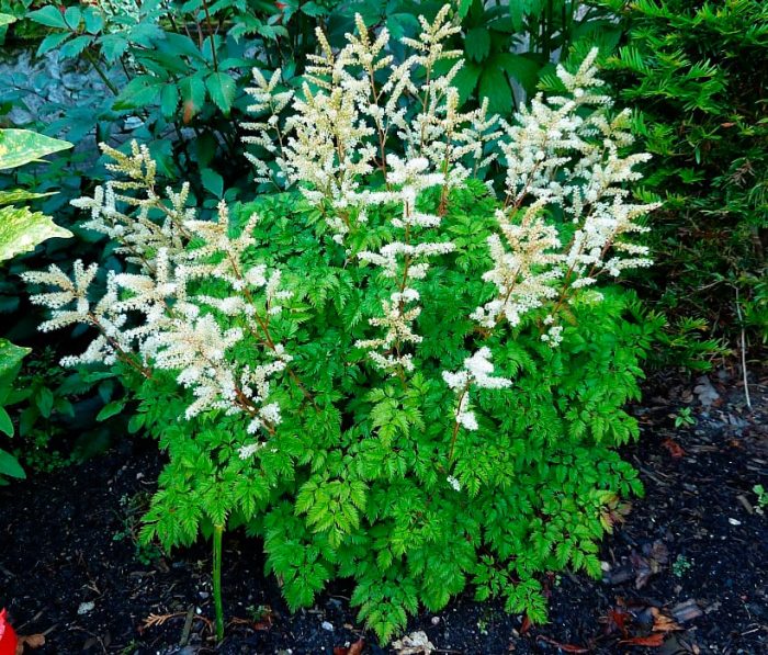 ta zwarta roślina w kształcie kuli ma około 25 centymetrów wysokości. Rozgałęzione śnieżnobiałe kwiatostany osiągają wysokość około 0,6 metra, przypominają gęste palcowe Gwiazdy. Krzew kwitnie w połowie maja, a czas kwitnienia wynosi ponad 4 tygodnie. Podczas dojrzewania nasiona są zabarwione na jasnoczerwony kolor, który podobnie jak kwiaty zdobi krzewy. Ażurowe nasycone zielone płyty liściowe są drobno rozcięte.