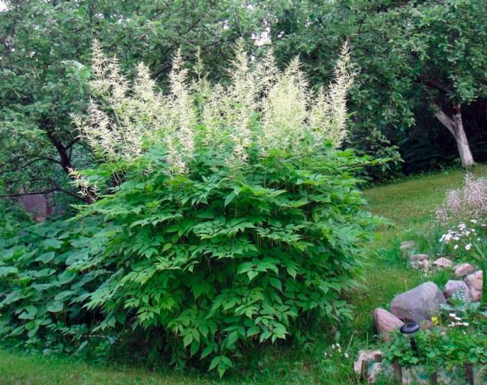 dorosły krzew ma wysokość od 100 do 150 cm, a jego średnica osiąga nie więcej niż 120 cm, jednak młody arunkus nie rośnie bardzo szybko. Potężne pędy są wyprostowane. Łodygi są całkowicie pokryte bogato zielonymi liśćmi z rzeźbionymi krawędziami, ich ogonki są długie.