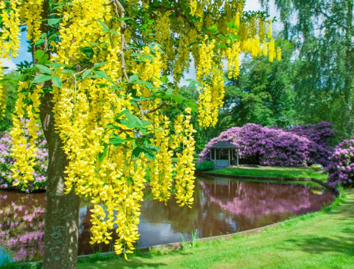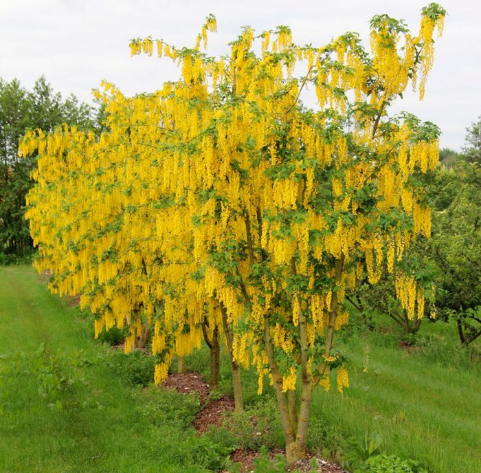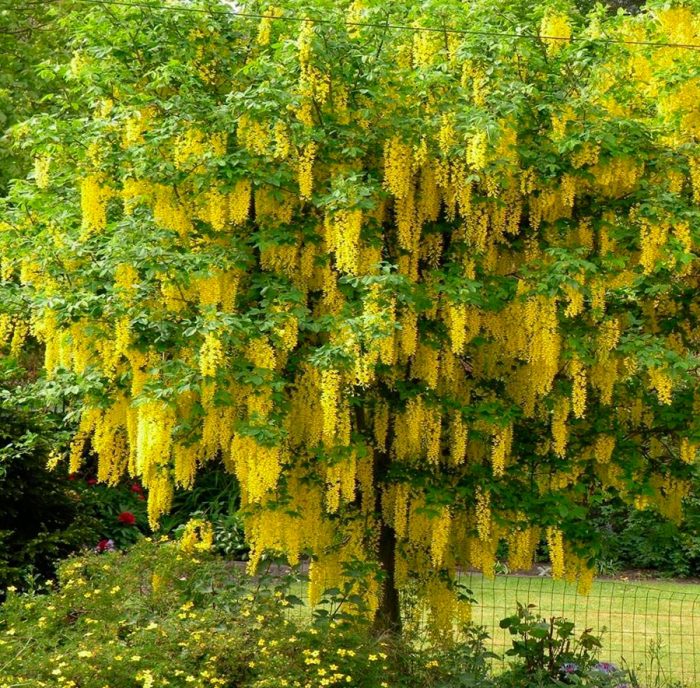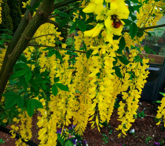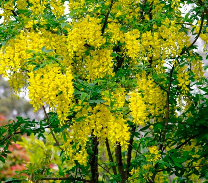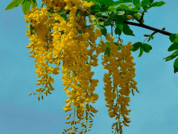 podczas kwitnienia roślina ta wygląda bardzo imponująco, dzięki czemu jest bardzo popularna wśród ogrodników. Ludzie nazywają go również "złotym deszczem fasoli", a wynika to z faktu, że kwitnący krzew jest ozdobiony długimi żółtymi kwiatostanami zwisającymi kaskadą.