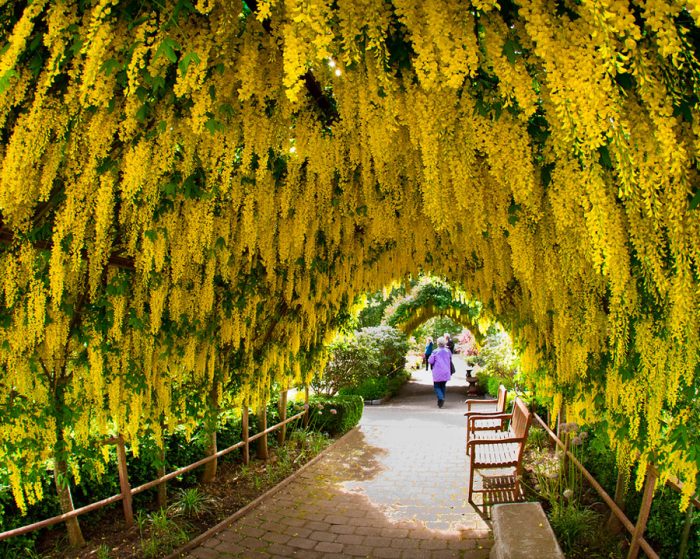 najczęściej w ogrodzie Laburnum służy do tworzenia baldachimów, łuków i tuneli. W górnej części tunelu łodygi są ułożone poziomo, co stymuluje bujne kwitnienie fasoli. Ta roślina wygląda również bardzo imponująco obok glicynii. Na tle zwisających łodyg fasoli floks, hortensja, róże itp.