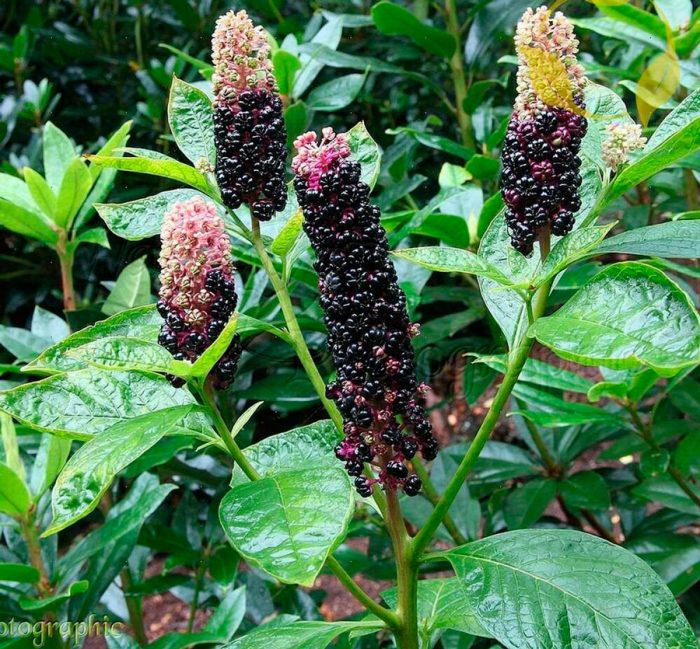 ciemne liście tego gatunku mają bardziej spiczasty kształt. Jednocześnie jagody tego krzewu wyglądają podobnie do jeżyn. Grube kwiatostany są pomalowane na różowo. Korzenie i owoce takiej rośliny zawierają truciznę. A młode liście i łodygi w krajach azjatyckich są używane do gotowania.