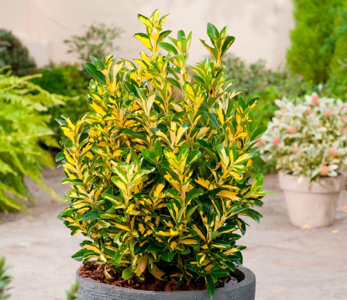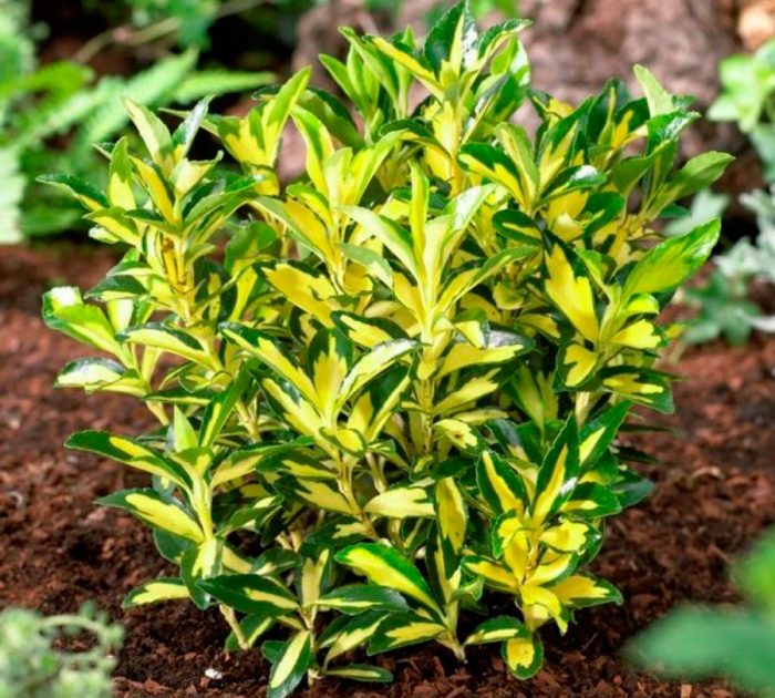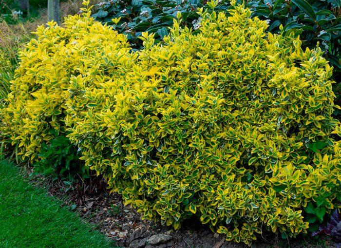 - Mediopictus . Spektakularne liście o złotym kolorze mają zieloną krawędź.