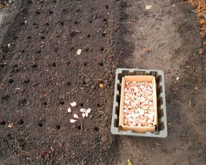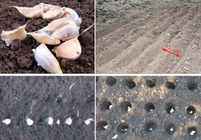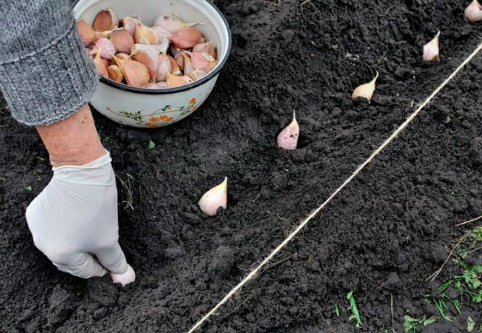 konieczne jest sadzenie czosnku w uprzednio zwilżonej glebie. Powierzchnia łóżka musi być wyrównana, a następnie wykonuje się na niej rowki o głębokości od 30 do 40 mm, a szerokość między nimi powinna wynosić od 25 do 30 centymetrów. Następnie rozprowadzają zęby, a odległość między środkowymi płatkami powinna wynosić co najmniej 8 centymetrów, a między dużymi-około 10-12 centymetrów. Nie należy wciskać plasterków w ziemię, ponieważ nie wpływa to dobrze na wzrost i rozwój systemu korzeniowego.