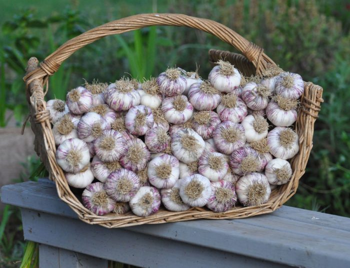 kiedy przed zbiorami pozostanie pół miesiąca, musisz całkowicie przestać podlewać czosnek. Ostrożnie oderwij glebę od żarówek, w tym przypadku wyschną i dojrzeją znacznie szybciej. Zbiory są zbierane w pogodny dzień, w tym celu krzaki są wykopywane widłami. Usuń resztki gleby z cebuli i rozłóż je do wyschnięcia. Aby to zrobić, czosnek można rozłożyć bezpośrednio na łóżku, gdzie wyschnie przez 5 dni. Jeśli zacznie padać deszcz, żarówki należy przenieść do suchego i dobrze wentylowanego pomieszczenia lub pod baldachimem. Suszone rośliny wraz z liśćmi i korzeniami. Po wyschnięciu cebul korzenie są skracane do maksymalnie 3 mm, liście są usuwane,a pędy są cięte, pozostawiając około 10 centymetrów. Następnie sortują żarówki według wielkości, po czym można je przechowywać. Aby to zrobić, wybierz suche i wentylowane pomieszczenie, a Temperatura powietrza może wynosić od 16 do 20 stopni lub od 2 do 4 stopni. Czosnek jest wiązany w wiązki lub tkany w warkocze lub można go po prostu umieścić w nylonowej pończochie lub siatkowej torbie i przechowywać w stanie zawieszenia. Również do przechowywania zbiorów można wlać do skrzynek z desek lub wiklinowych koszy. Jeśli czosnek jest przechowywany w naczyniach wykonanych ze szkła lub plastiku, zaleca się posypanie go gruboziarnistą solą, która doskonale pochłania wilgoć.