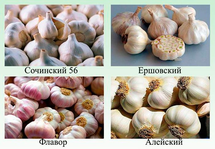 rozróżnij czosnek zimowy i wiosenny. W obu odmianach struktura jest podobna, ale w odmianach zimowych Duże goździki znajdują się w 1 rzędzie, a w wiosennych ― małe płaty są umieszczone w kilku rzędach. Ponadto w zimowym czosnku po dojrzewaniu w cebuli pozostaje część strzałki kwiatowej, która jest prętem dzielącym, a wokół niej są już umieszczone zęby, w odmianach wiosennych nie ma takiego pręta, ponieważ nie strzelają. Czosnek zimowy można sadzić w ziemi wiosną, ale jego cebule w tym przypadku nie podzielą się na zęby, ponieważ nie będą miały wystarczająco dużo czasu, dlatego zaleca się sadzenie go jesienią. Do rozmnażania odmian zimowych stosuje się żarówki i plastry.