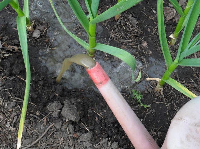 po pojawieniu się pierwszych kiełków w ogrodzie czosnek będzie potrzebował górnego opatrunku nawozem zawierającym azot. W tym celu możesz użyć naparu z trawy, próchnicy, roztworu odchodów ptaków (12:1) lub dziewanny (10:1), a także możesz wziąć nawozy mineralne. Takiej uprawy nie można karmić świeżym obornikiem. Ponowne karmienie odbywa się pół miesiąca po pierwszym, używając do tego płynnego roztworu odżywczego.